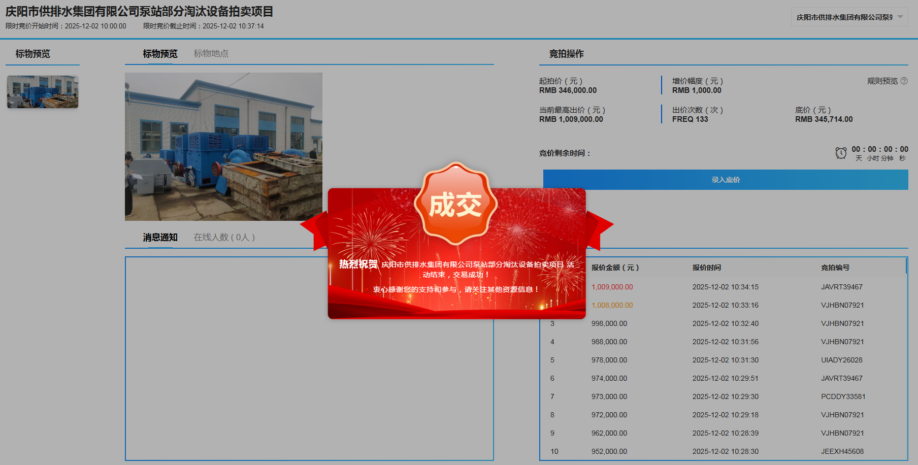 近日,庆阳市公共资源交易中心以网络竞价方式,成功拍卖庆阳市供排水集团有限公司泵站一批淘汰设备,28个意向受让方你争我抢,经过133轮激烈竞价,最终以100.9万元成交,竞价增值66.3万元,增值率达到191.6%,创下2025年全市权益类资产最高增值纪录。